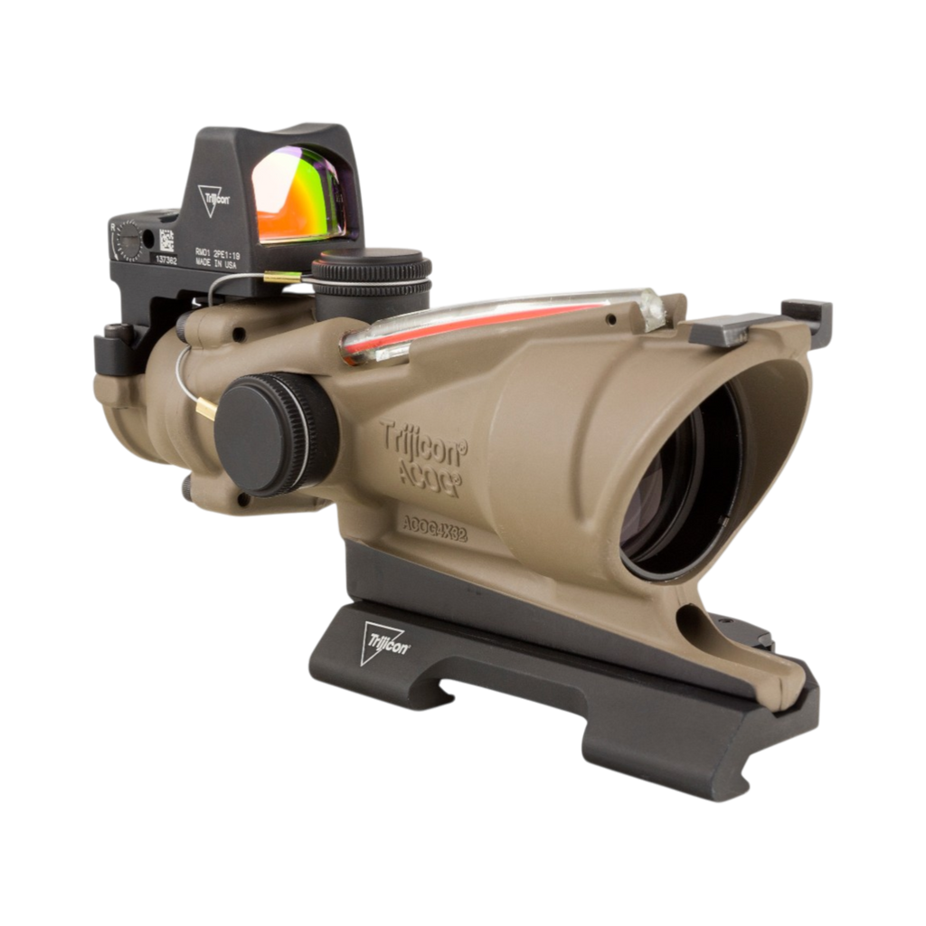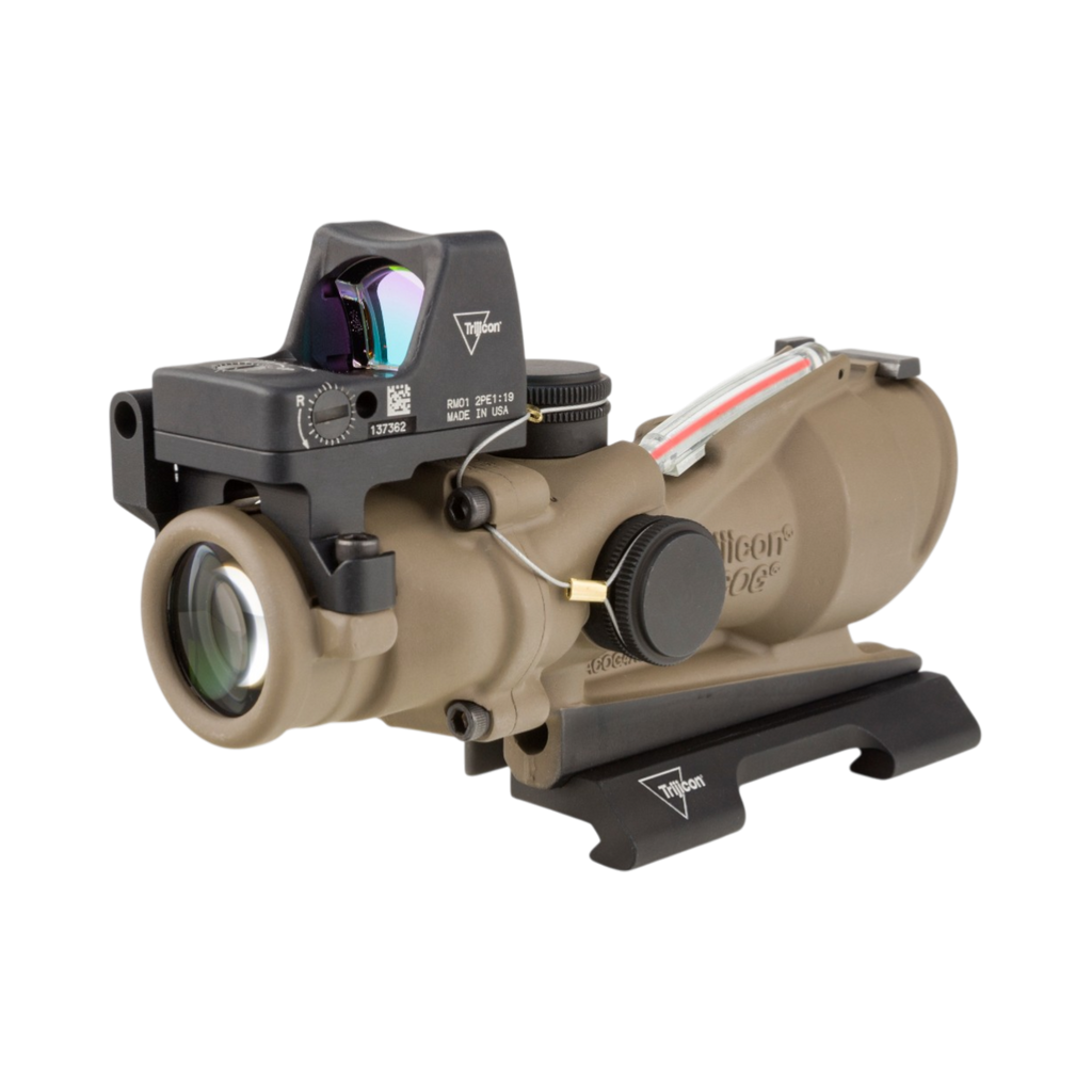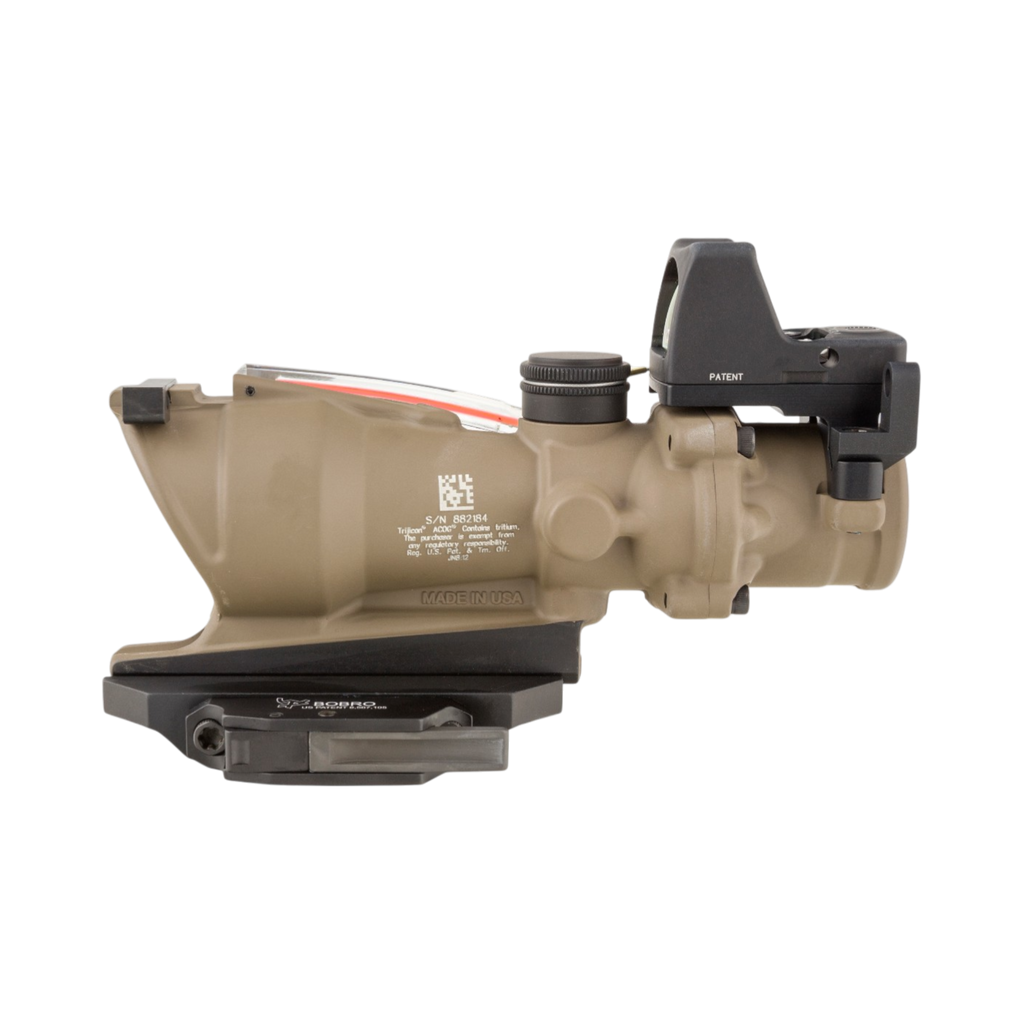 The Trijicon ACOG ECOS is the ultimate sight for both Close Quarter Battle (CQB) situations and longer distance shooting where accuracy and pinpoint bullet placement are required. This dual-sighting system gives the shooter a distinct tactical advantage with the option of either the Trijicon ACOG or RMR Type 2 sight. With the quick target acquisition of the RMR Type 2 Sight or the precise aiming capabilities provided by the magnified 4 power Trijicon ACOG— the shooter has the ability to select the proper aiming solution for the situation at hand—truly the best of both worlds. No tools are needed for windage and elevation adjustments because the ECOS also features external windage and elevation adjusters, making it waterproof up to 11m without caps.