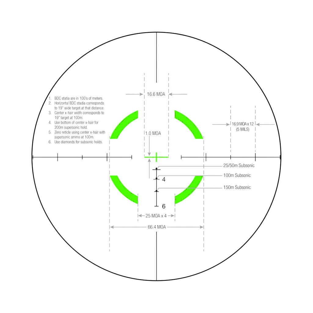 The Trijicon 1-6x24 VCOG® (Variable Combat Optical Gunsight) is a rugged variable powered riflescope that accommodates close quarter battle (CQB) and long distance marksmanship. It features superior glass quality and light gathering capabilities with zero distortion. The bullet drop compensating and ranging reticles allow for the shooter to quickly and accurately estimate range and apply the correct hold. The first focal plane reticle allows the subtensions and drops to remain true at any magnification. With a forged 7075-T6 aircraft-aluminum-alloy housing, the VCOG is an exceptionally durable and nearly indestructible sighting system. Robust enough for any application, the VCOG utilizes a single AA battery, commonly found across the globe and offers 6 adjustable brightness settings for the LED reticle. When powered by a lithium AA battery (like the one provided), it boasts a considerable battery life of 1400 hours at setting 4 (constant on). An integrated dial fin allows easy rotation through the magnification range and a constant eye relief means no head or stock position adjustments are needed. Waterproof to 20 meters (66 ft.).