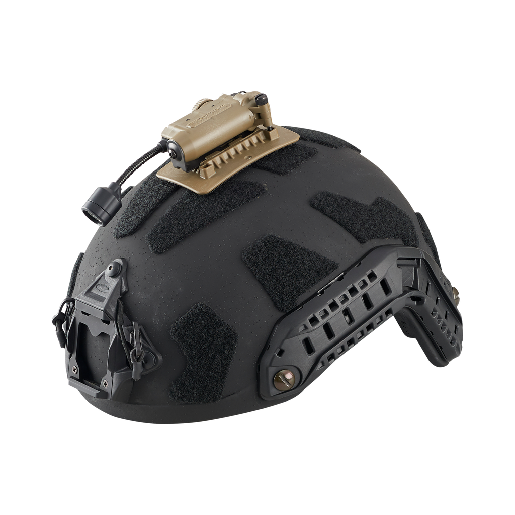 - Tvirtas spaustukas pritvirtinamas prie šalmo arba MOLLE liemenės, užtikrinantis lankstumą ir leidžiantis naudotis rankas laisvą apšvietimą.