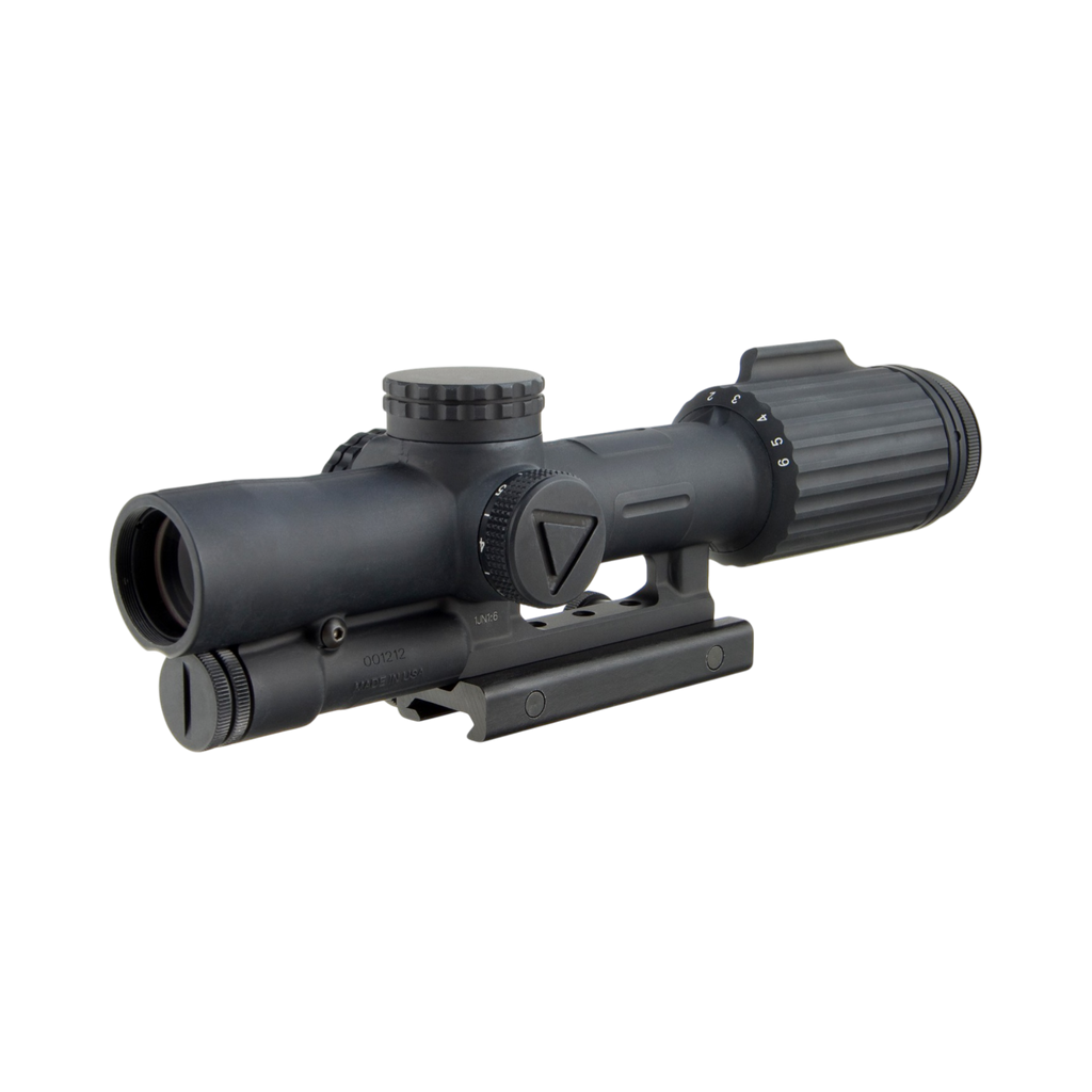 The Trijicon 1-6x24 VCOG® (Variable Combat Optical Gunsight) is a rugged variable powered riflescope that accommodates close quarter battle (CQB) and long distance marksmanship. It features superior glass quality and light gathering capabilities with zero distortion. The bullet drop compensating and ranging reticles allow for the shooter to quickly and accurately estimate range and apply the correct hold. The first focal plane reticle allows the subtensions and drops to remain true at any magnification. With a forged 7075-T6 aircraft-aluminum-alloy housing, the VCOG is an exceptionally durable and nearly indestructible sighting system. Robust enough for any application, the VCOG utilizes a single AA battery, commonly found across the globe and offers 6 adjustable brightness settings for the LED reticle. When powered by a lithium AA battery (like the one provided), it boasts a considerable battery life of 700 hours at setting 4 (constant on). An integrated dial fin allows easy rotation through the magnification range and a constant eye relief means no head or stock position adjustments are needed. Waterproof to 20 meters (66 ft.).