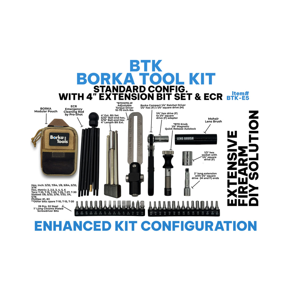 Katrs BTK-E5 komplekts ietver visas BTK-E1 sastāvdaļas, kā arī augstākās kvalitātes Borka®/Pro-Shot® avārijas tīrīšanas stieni. Izturīgajā Cordura® neilona maisiņā atradīsiet: