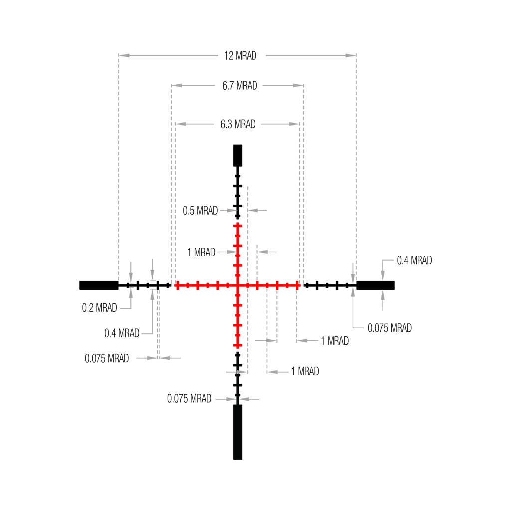 Tēmēklis ar otro fokusa plakni (SFP) un sarkanu MRAD attāluma mērītāju, 30 mm caurule, matēti melns, regulatori ar zemiem vāciņiem