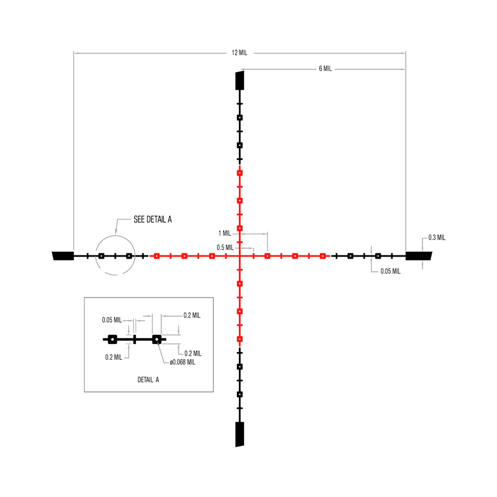 Tēmēkļa ar otro fokusa plakni (SFP) un sarkanu MIL-kvadrātu, 1 collas caurule, matēti melna, regulatori ar zemiem vāciņiem
