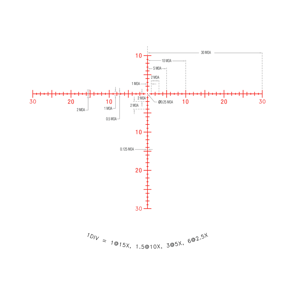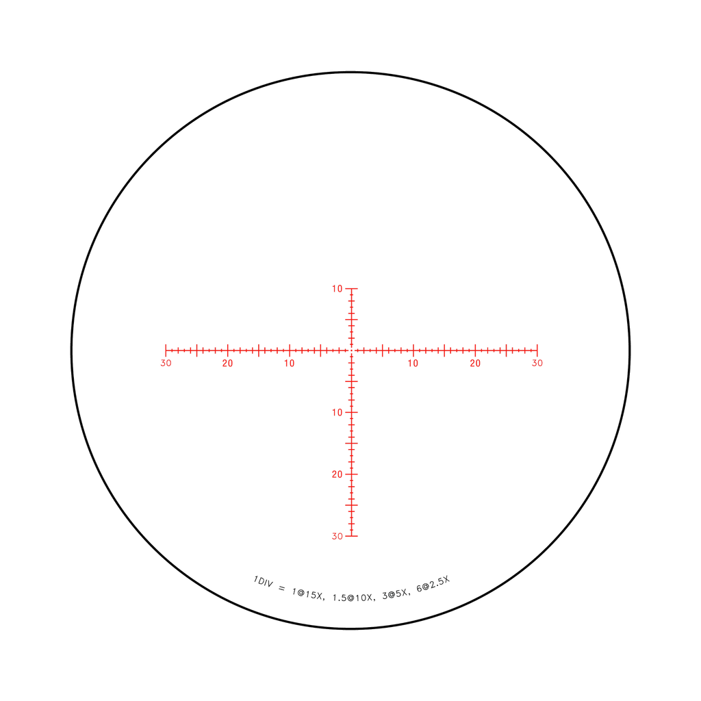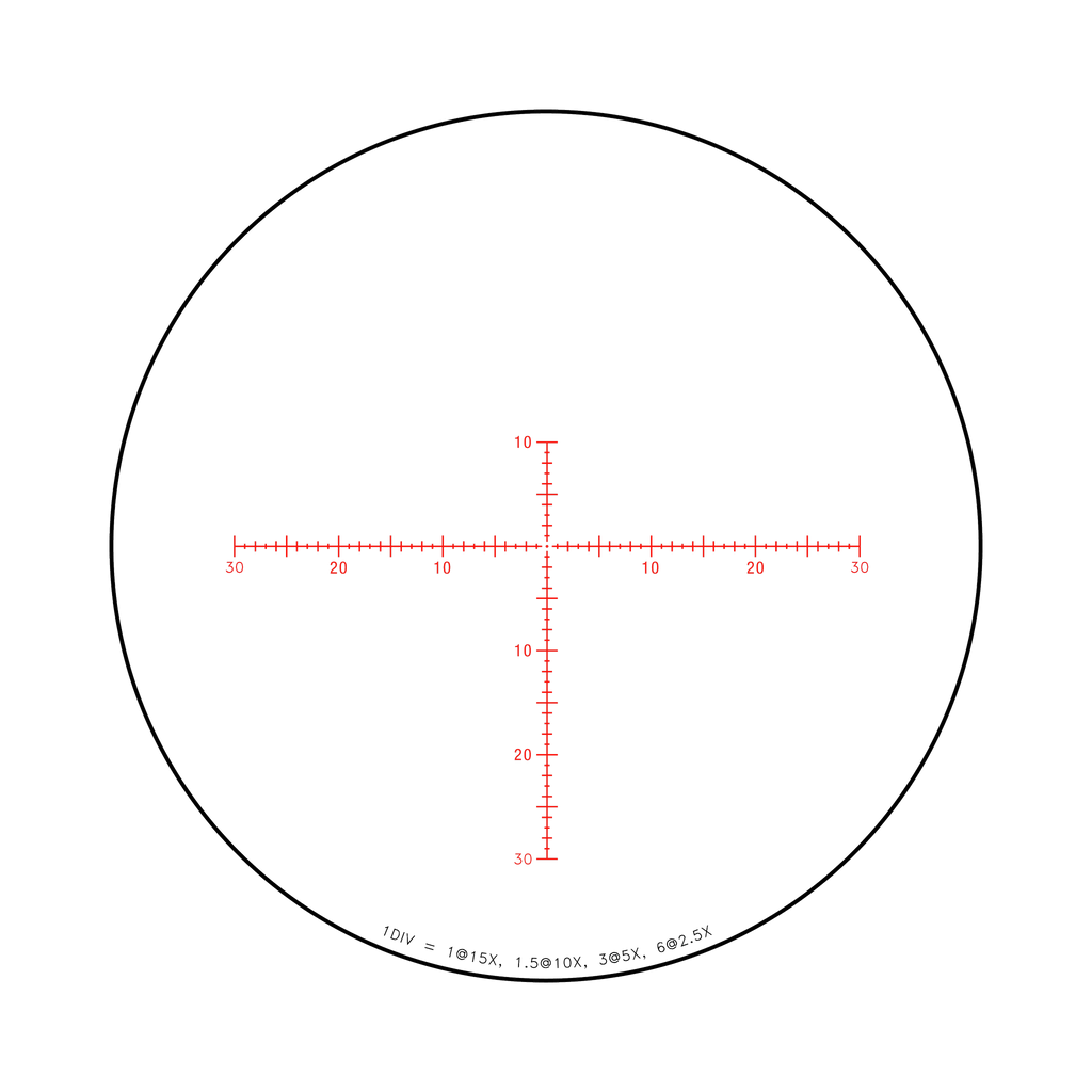 Tēmēkļa optika ar otro fokusa plakni (SFP), sarkanu MOA centrālo punktu, 30 mm cauruli, satīna melnā krāsā, atklātu augstuma regulētāju ar atgriešanās uz nulles funkciju