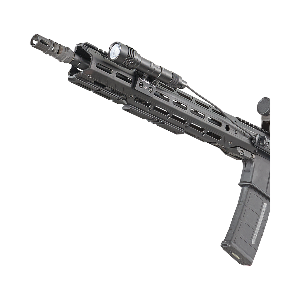 625 lūmenuProTac®Rail Mount 2 ir aprīkots ar fiksētu stiprinājumu MIL-STD-1913 (Picatinny) sliedēm un izmanto vai nu tālvadības slēdzi ar momentānu/pastāvīgu darbību, vai standarta pogas slēdzi aizmugurē.