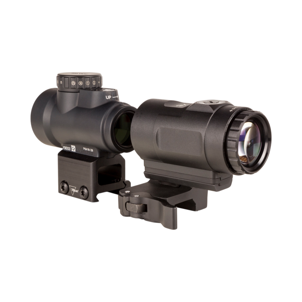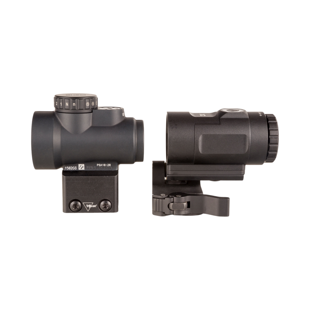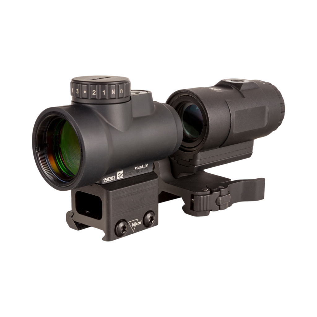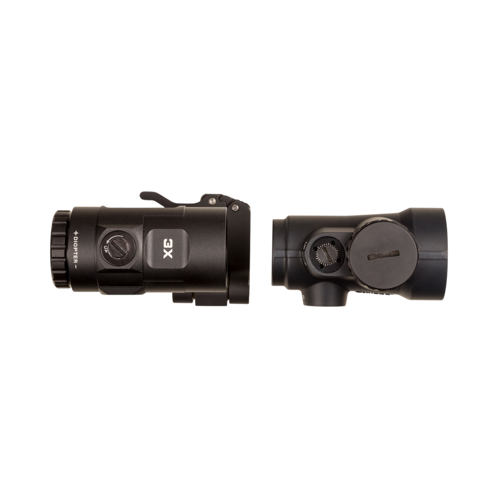 Adjustable 68 MOA Reticle with a 2.0 MOA Dot on a Full Co-Witness Mount; 3x Magnifier with Quick Release Flip-to-Side Mount