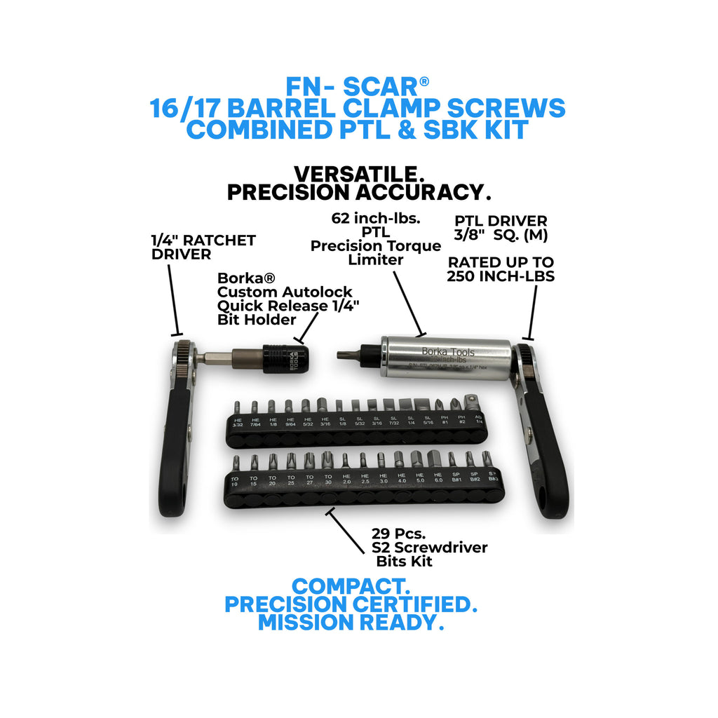 Precyzyjny zestaw ogranicznika momentu obrotowego przeznaczony do montażu śruby zaciskowej lufy FNH SCAR 16/17. Ta pojedyncza jednostka PTL zapewnia stały moment obrotowy 62 cali na funt, zapobiegając nadmiernemu dokręceniu, które mogłoby wpłynąć na wyrównanie lufy i jej celność. Zawiera elementy SBK (Specialized Barrel Kit) zapewniające płynną integrację z platformą. Idealny dla rusznikarzy i strzelców precyzyjnych, którzy wymagają powtarzalnych, fabrycznie poprawnych wartości momentu obrotowego. Profesjonalne narzędzie do krytycznych zastosowań związanych z montażem broni palnej.