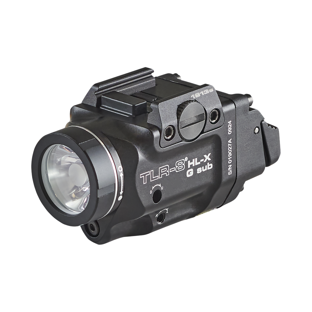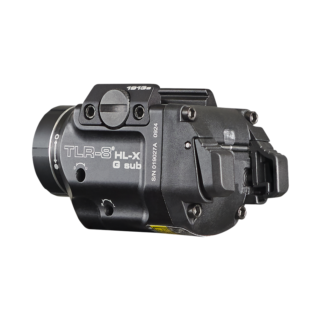 Wielopaliwowa latarka TLR-8 HL-X G montowana na szynie z zielonym laserem może być zasilana akumulatorem litowo-jonowym SL-B9® USB lub baterią litową CR123A. Wyposażona jest w przełączniki łopatkowe wysokiego i niskiego natężenia, które można dostosować do własnego stylu strzelania.
