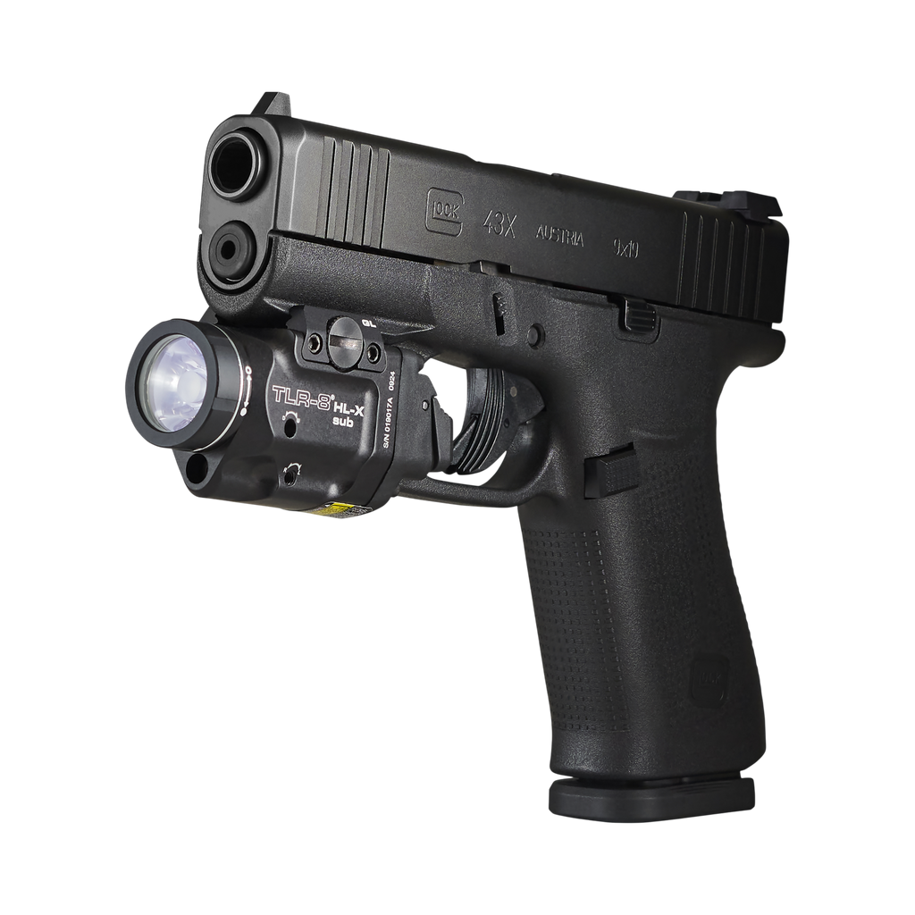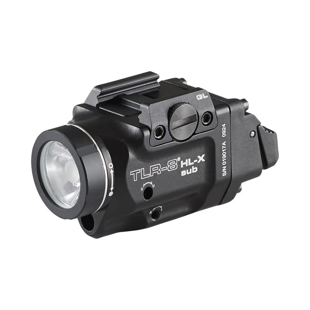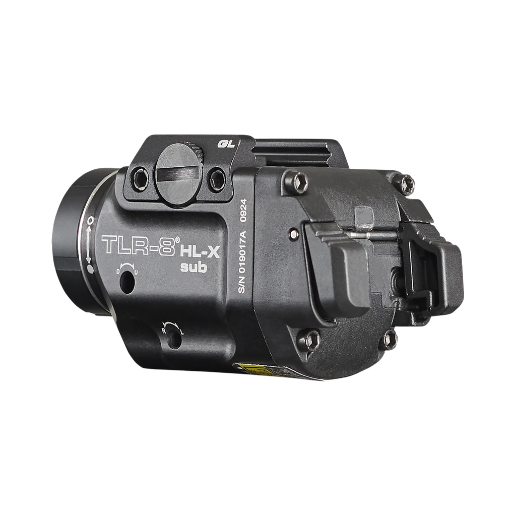 Lampa TLR-8® HL-X o wysokim strumieniu świetlnym, montowana na szynie, została zaprojektowana tak, aby zapewnić większy zasięg wiązki światła. Obsługuje ona zarówno akumulator litowo-jonowy SL-B9® USB-C Streamlight, jak i pojedynczą baterię litową CR123A. Wymienne tylne przełączniki dostosowują się do stylu strzelania użytkownika.