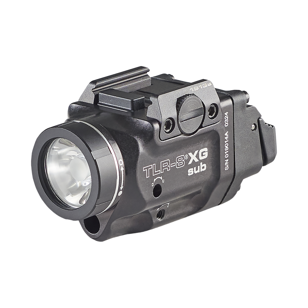 Latarka TLR-8® X G montowana na szynie dolnej może być zasilana baterią litową CR123A lub akumulatorem litowo-jonowym SL-B9® USB Streamlight. Wymienne przełączniki tylne dostosowują się do stylu strzelania użytkownika.