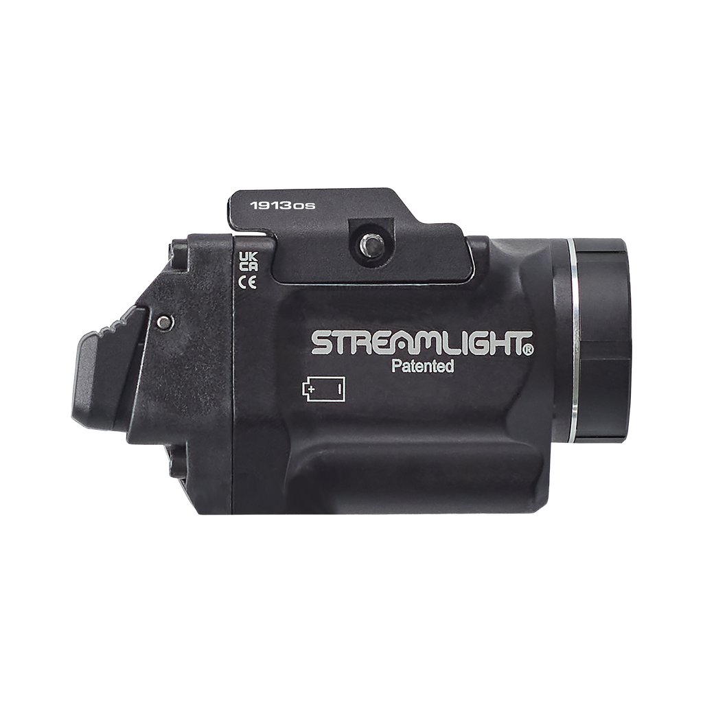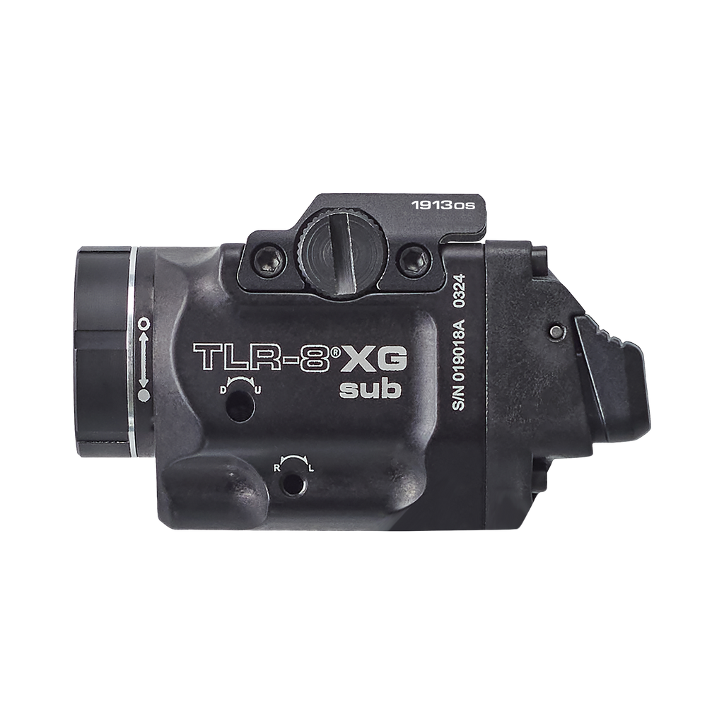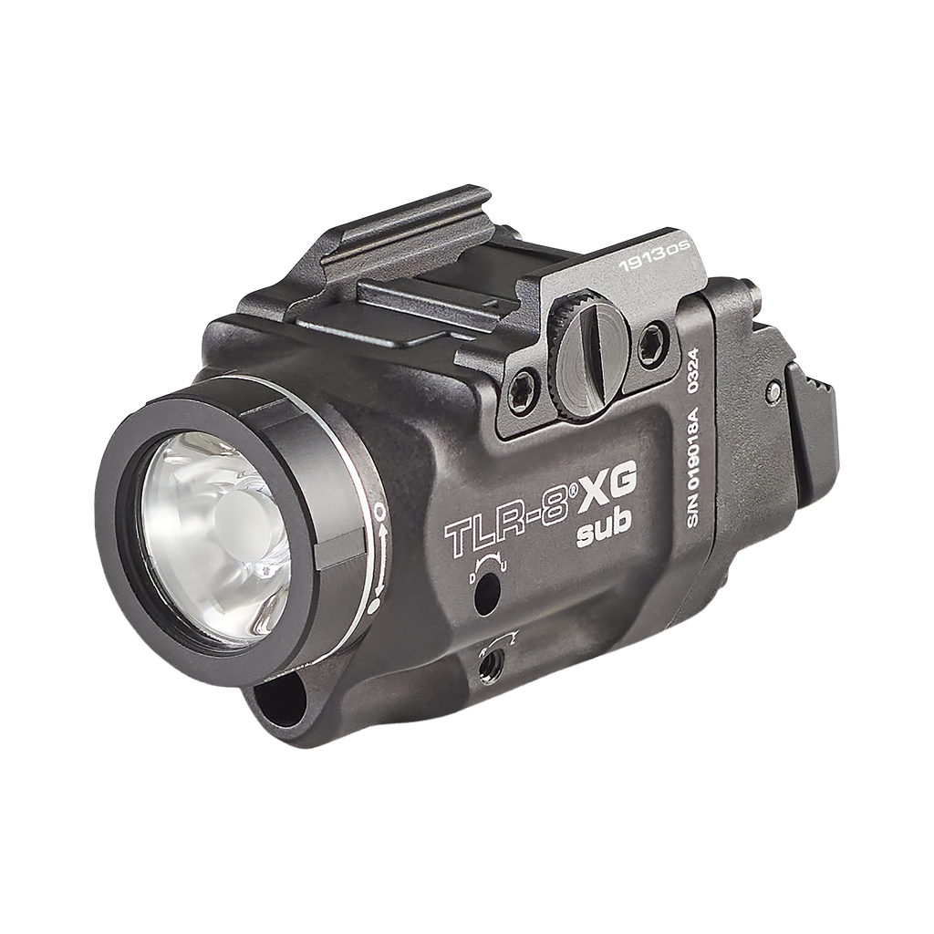 Latarka TLR-8® X G montowana na szynie dolnej może być zasilana baterią litową CR123A lub akumulatorem litowo-jonowym SL-B9® USB Streamlight. Wymienne przełączniki tylne dostosowują się do stylu strzelania użytkownika.