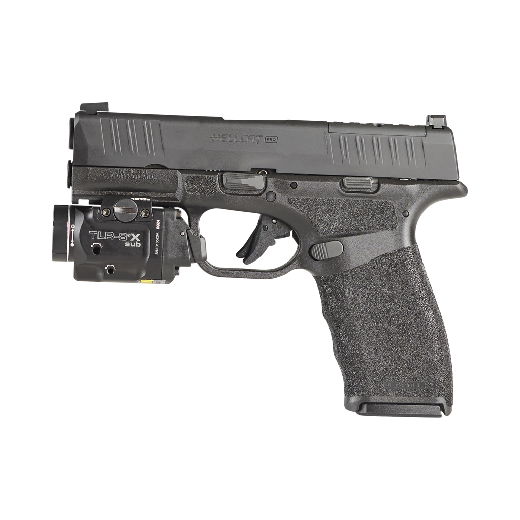 Latarka TLR-8® X montowana na szynie dolnej może być zasilana baterią litową CR123A lub akumulatorem litowo-jonowym SL-B9® USB Streamlight. Wymienne przełączniki tylne można dostosować do własnego stylu strzelania.
