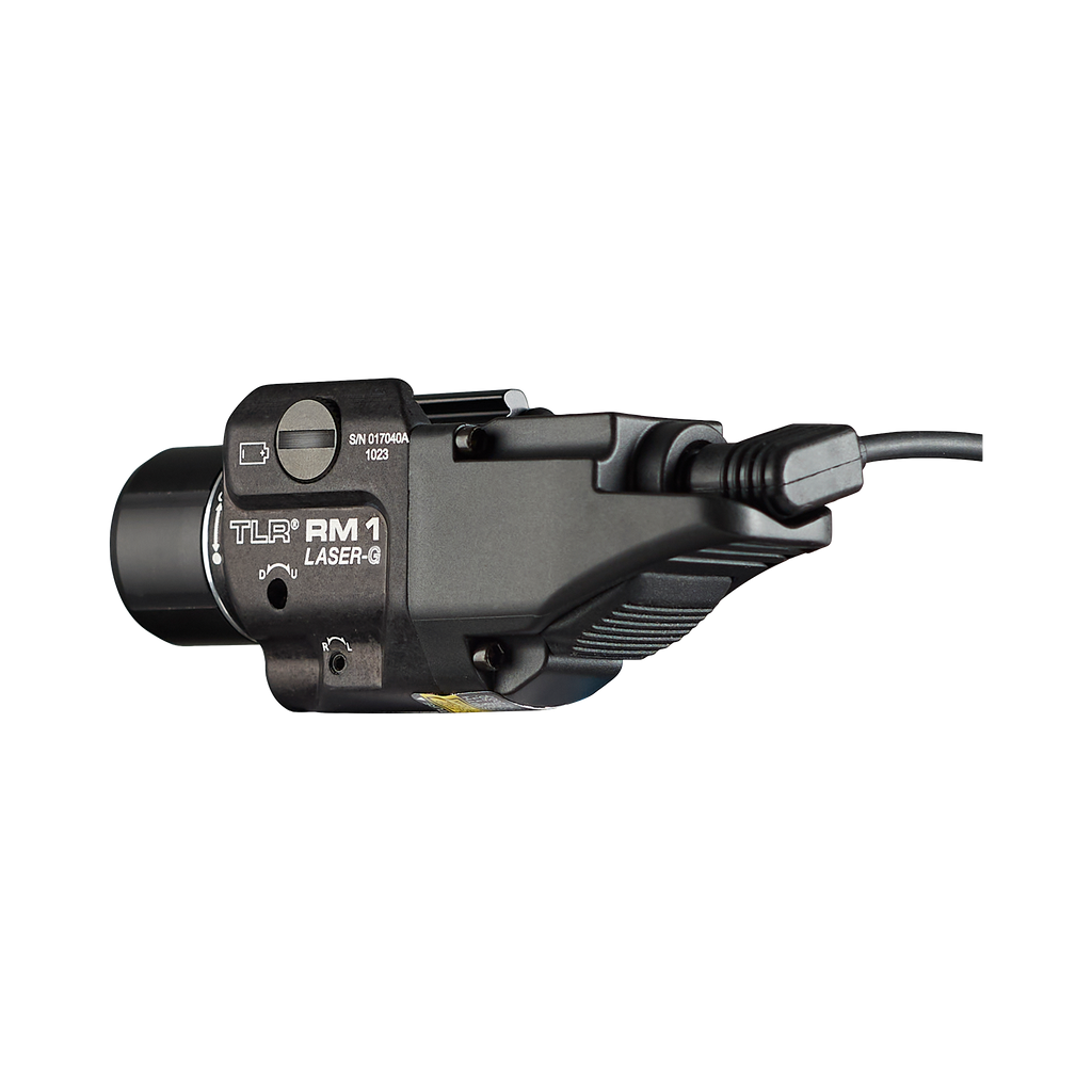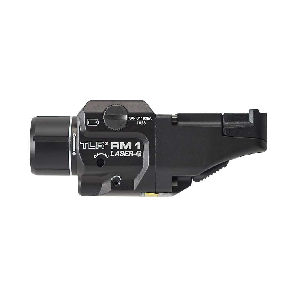 Niskoprofilowa latarka TLR® RM 1 Laser-G charakteryzuje się większym zasięgiem i węższym strumieniem światła. Została zaprojektowana tak, aby generować większą liczbę kandeli przy zachowaniu mocy strumienia świetlnego. Niezależnie działające przyciski i zdalne przełączniki ciśnieniowe zapewniają pewność, że zawsze będziesz mieć światło.