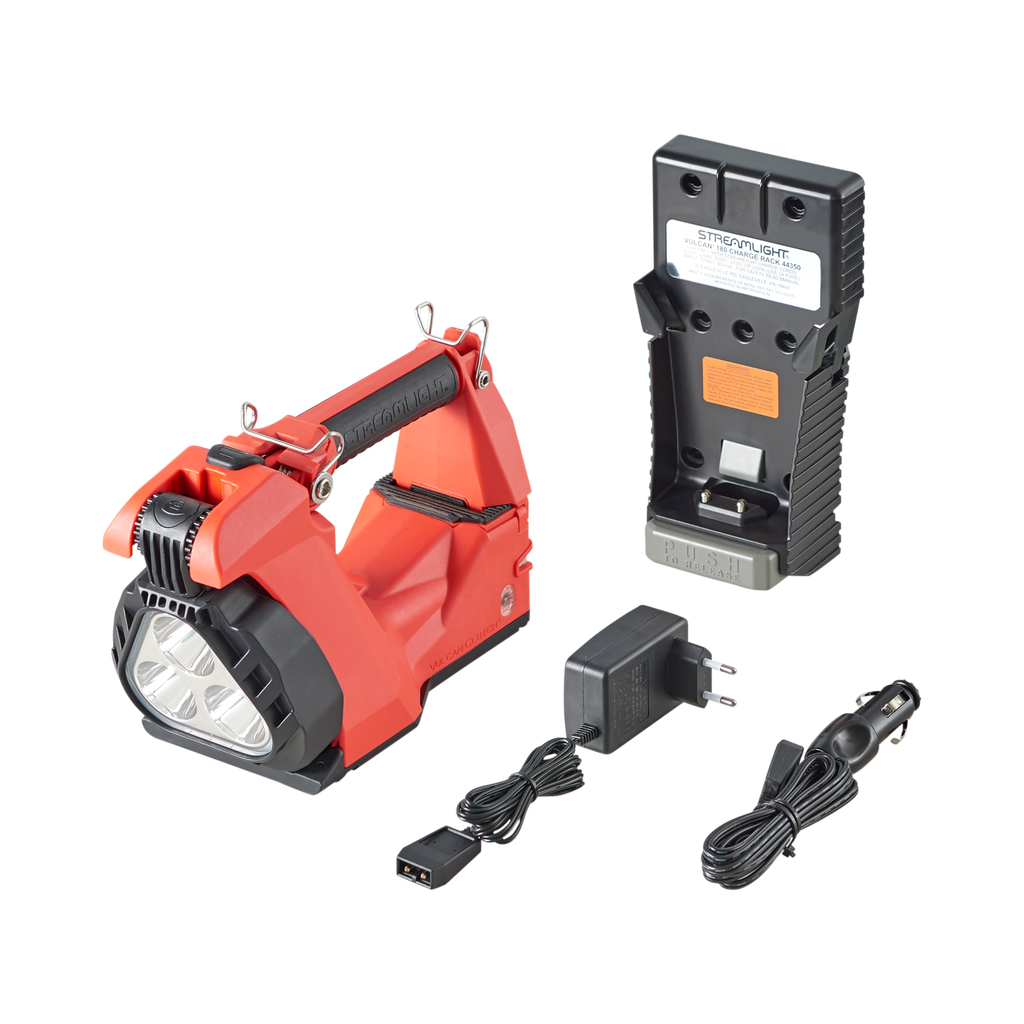 - System standardowy— szybki montaż stojaka ładującego, przewody ładujące AC/DC; model pomarańczowy zawiera pasek na ramię z szybkim zapięciem; model żółty zawiera wytrzymały pasek.