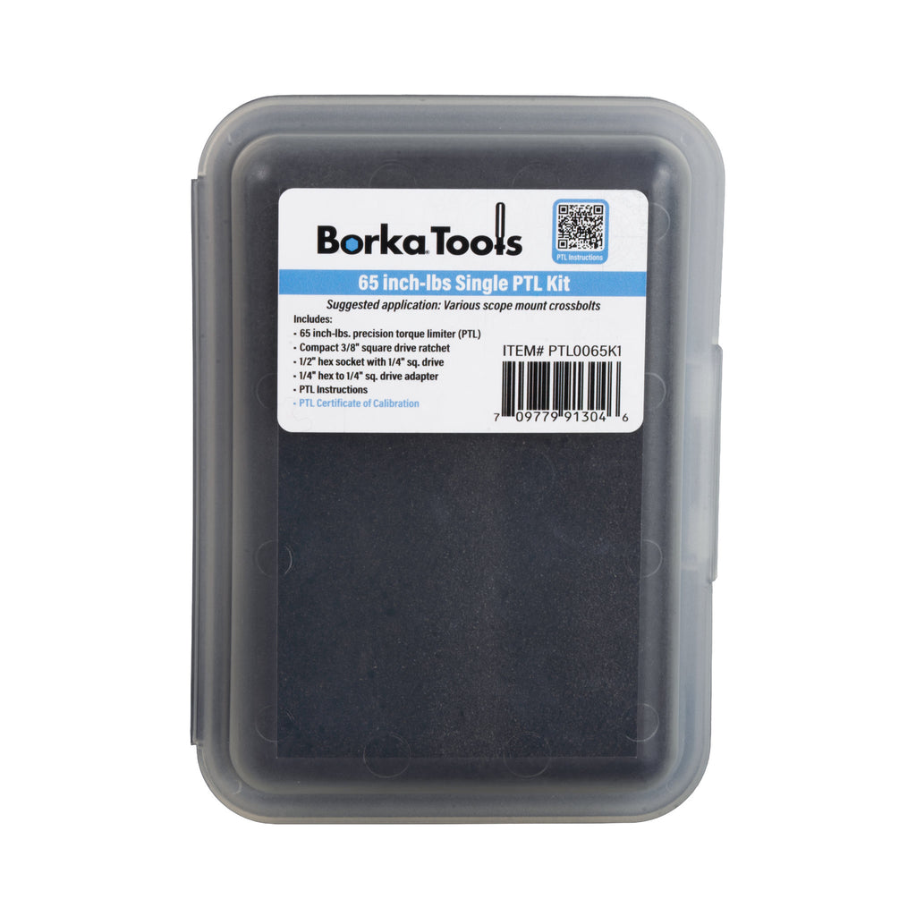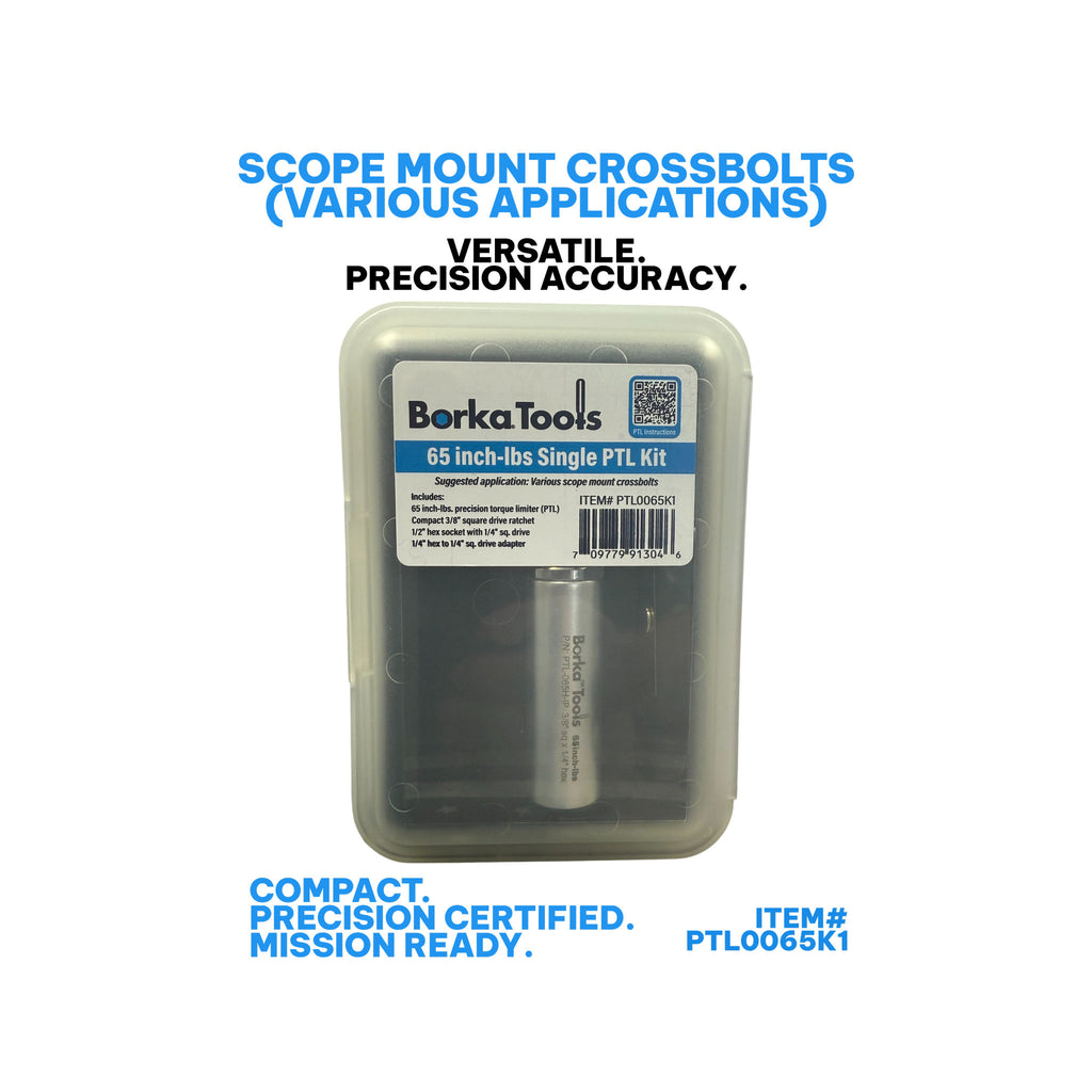 Precision torque limiter designed for scope mount crossbolts, delivering consistent 65 inch-lbs of torque to prevent over-tightening and potential damage. This single PTL kit ensures proper fastener tension across various scope mounting systems, protecting both your optics and firearm. Engineered for shooters and gunsmiths who demand accuracy in every assembly step. Essential for maintaining optimal sight alignment and extending equipment longevity.